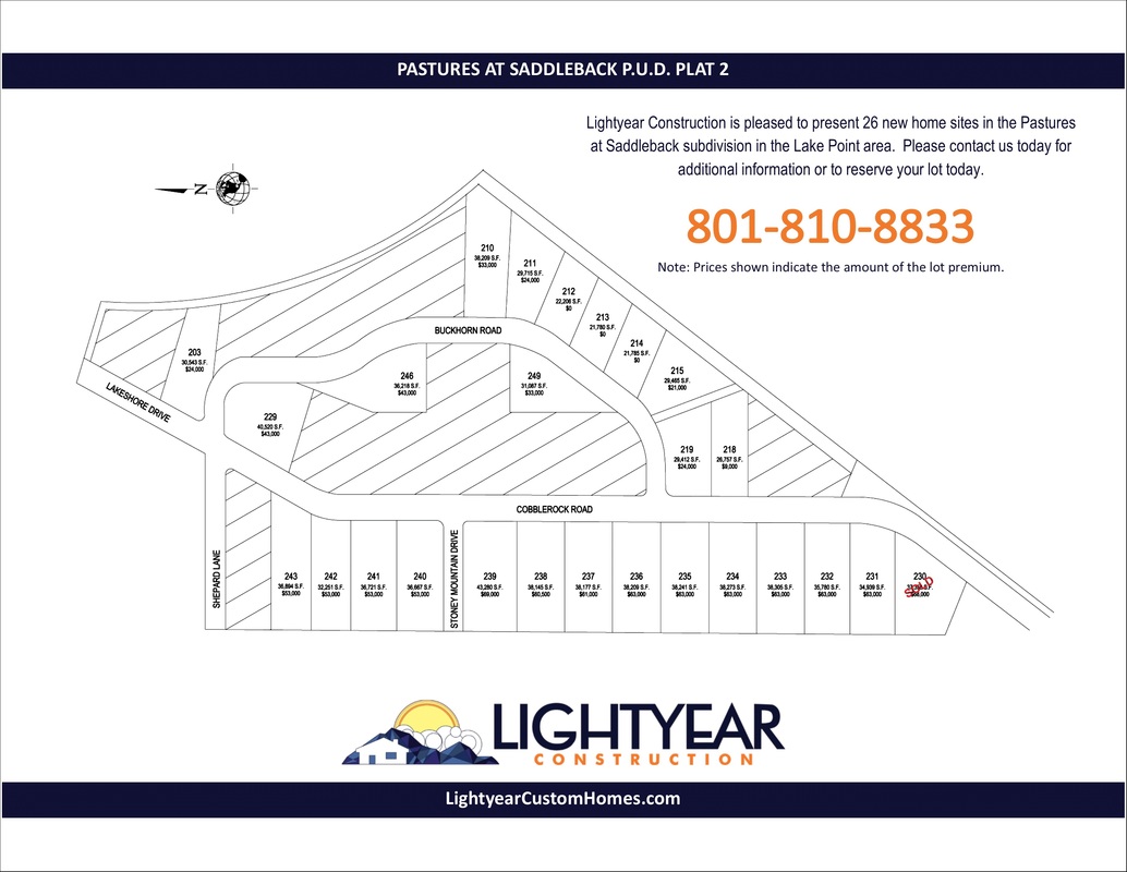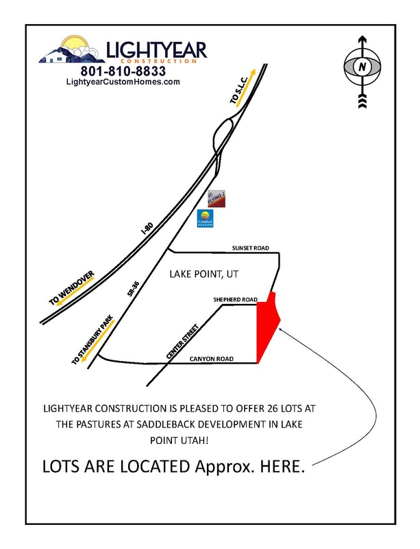 Lightyear Construction is pleased to present 26 new home sites in the Pastures at Saddleback subdivision in the Lake Point area. Please contact us today for additional information or to reserve your lot today.